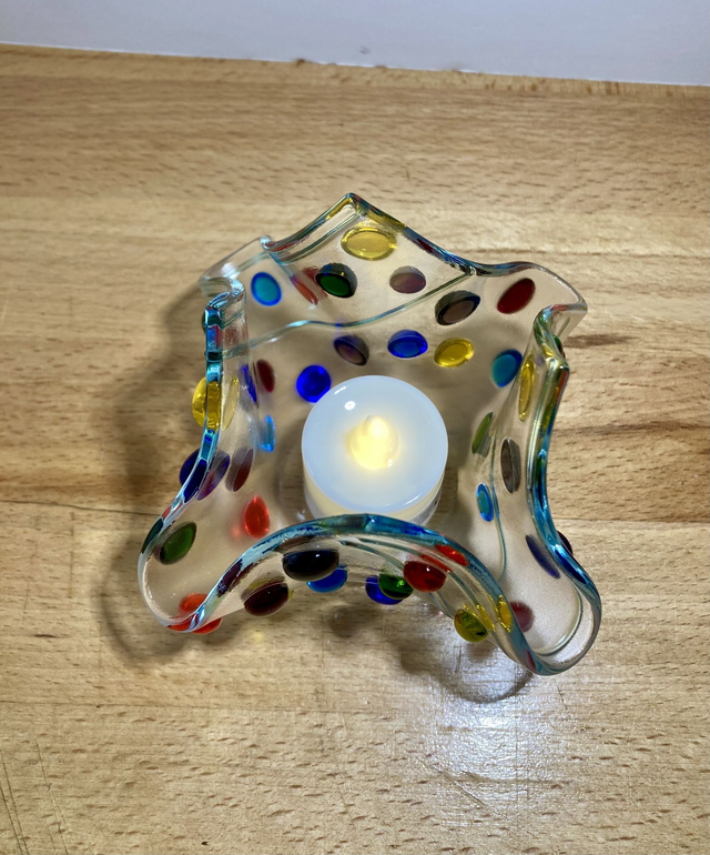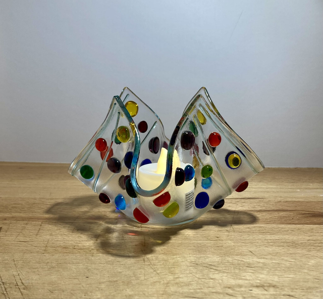Handkerchief style tea light holder made from fused glass with a dotty rainbow design
