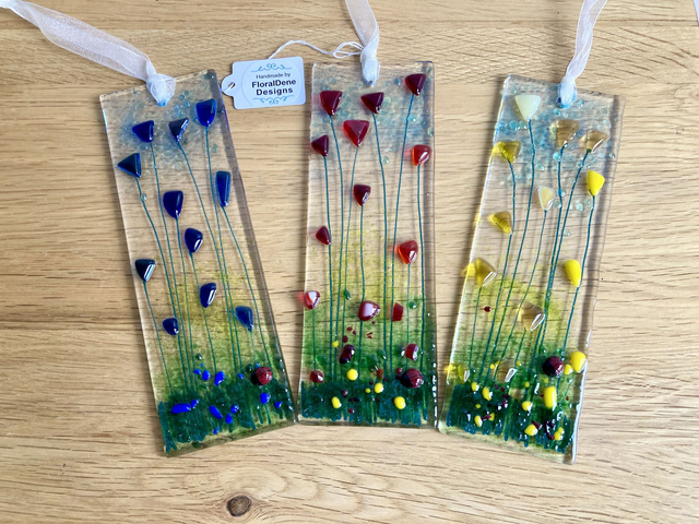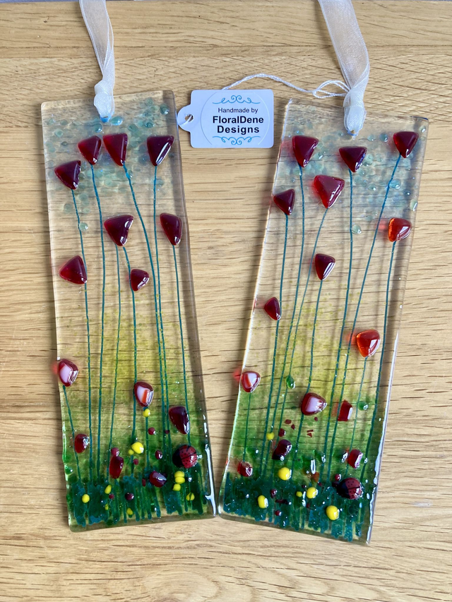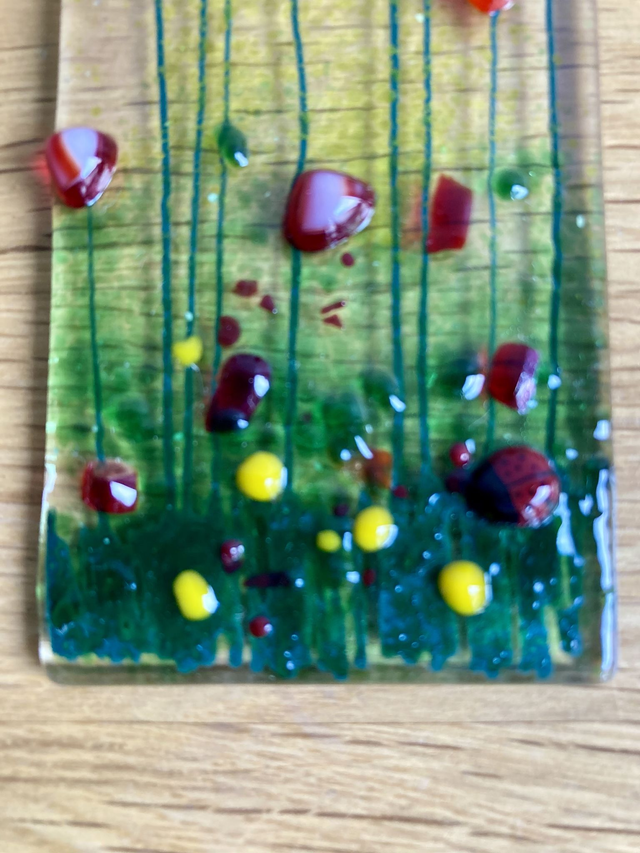 Pretty fused glass floral meadow picture in a wishstick shape. Looks great hung in a window with the light catching it, or can be wall hung
