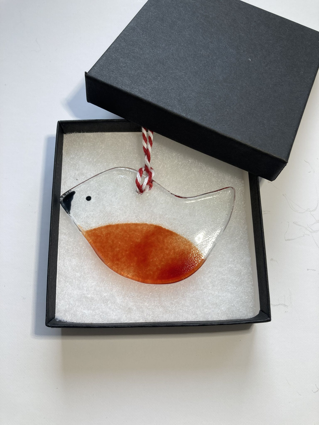 Add a touch of festive charm to your Christmas tree with this adorable Robin fused glass ornament.